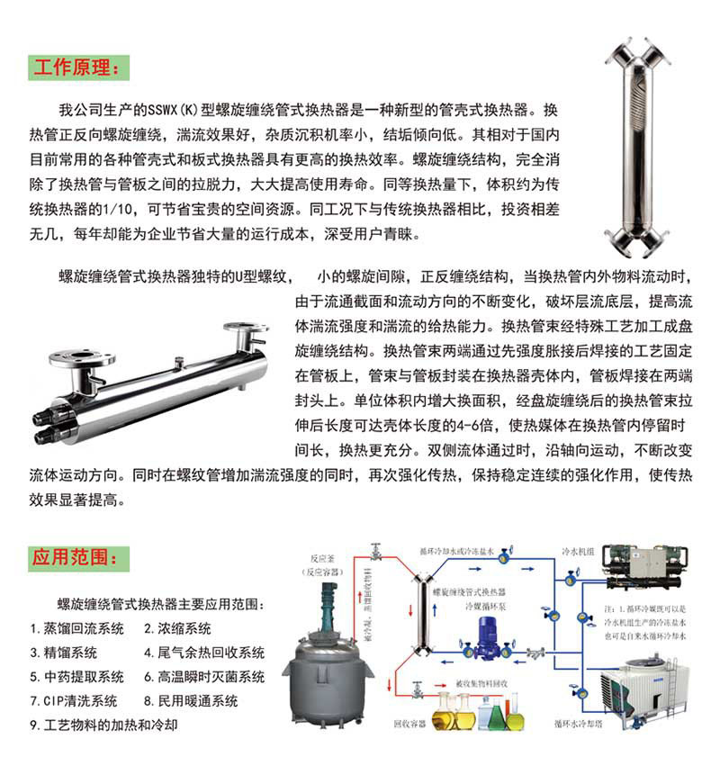 螺旋纏繞管式換熱器是我公司在引進先進換熱技術(shù)的基礎(chǔ)上,與山東建筑大學聯(lián)合研制開發(fā)的新型換熱設(shè)備。是新一代換熱產(chǎn)品中的代表作品,主要適用于汽-液換熱工況,與其他形式的換熱器相比,換熱系數(shù)提高1-3倍,廣泛應(yīng)用于制藥、精細化工、食品飲料、石油化工、熱電聯(lián)產(chǎn)、洗浴、區(qū)域供熱等場合。